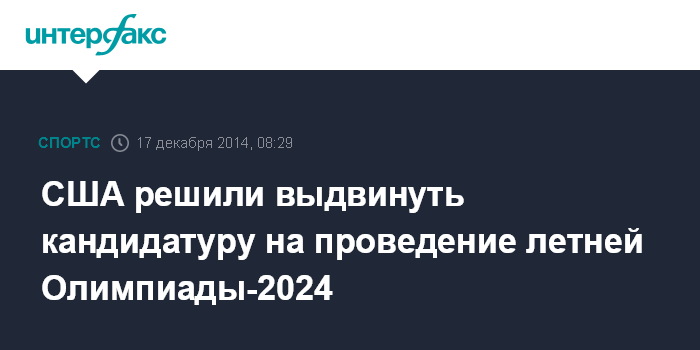 Москва. 17 декабря. INTERFAX.RU - Олимпийский комитет США принял решение выдвинуть кандидатуру Соединенных Штатов в качестве страны-хозяйки летних Олимпийских и Паралимпийских игр 2024 года.