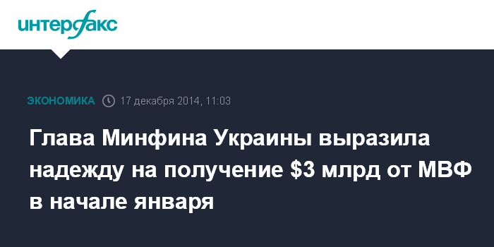 Москва. 17 декабря. INTERFAX.RU – Кабинет министров Украины рассчитывает на то, что Верховная Рада до 26 декабря примет налоговый и бюджетный пакет, так как это оставляет шансы на получение очередного кредитного транша МВФ в размере $3 млрд в начале января 2015 года, сообщила The Wall Street Journal со ссылкой на интервью министра финансов Наталии Яресько.