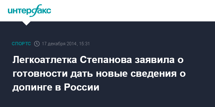 Москва. 17 декабря. INTERFAX.RU - Российская бегунья Юлия Степанова заявила, что у нее имеется больше доказательств о фактах массового применения допинга в России, чем у телеканала ARD, снявшего об этом фильм.