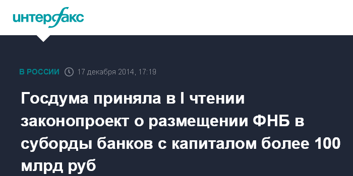 Москва. 17 декабря. INTERFAX.RU - Госдума на заседании в среду приняла в первом чтении законопроект, позволяющий направлять до 10% средств Фонда национального благосостояния (ФНБ) в субординированные депозиты или облигации банков с капиталом не менее 100 млрд рублей.