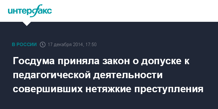 Москва. 17 декабря. INTERFAX.RU - Госдума приняла в третьем, окончательном чтении правительственный закон о возможности допуска к педагогической деятельности лиц, совершивших нетяжкие преступления.