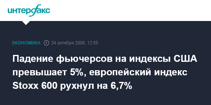 Значение фьючерса на индекс S&P 500 упало к 12:34 мск на 6,3%, Dow Jones и Nasdaq - более 5,5%, европейский индекс Dow Jones Stoxx 600 рухнул на 6,7%, снижение остальных фондовых индикаторов Европы превышает 5%. Индекс MSCI World Index опустился в ходе торгов на 3,2% - до 881,48 пункта, с начала этой недели его падение составило 7,4%, с начала года - 45%.