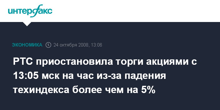 Москва. 24 октября. INTERFAX.RU - Фондовая биржа РТС приостановила в пятницу торги всеми акциями с 13:05 МСК на час из-за падения технического индекса биржи более чем на 5% к уровню закрытия предыдущего дня, сообщила биржа.