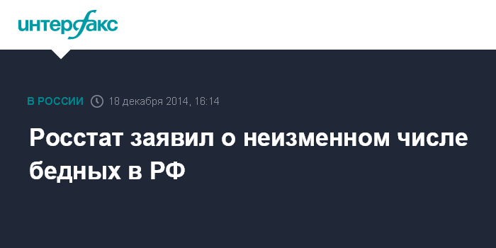 Москва. 18 декабря. INTERFAX.RU - Число бедных в РФ в январе-сентябре 2014 года составило 18 млн человек, сохранившись на уровне января-сентября 2013 года, сообщил в четверг Росстат.