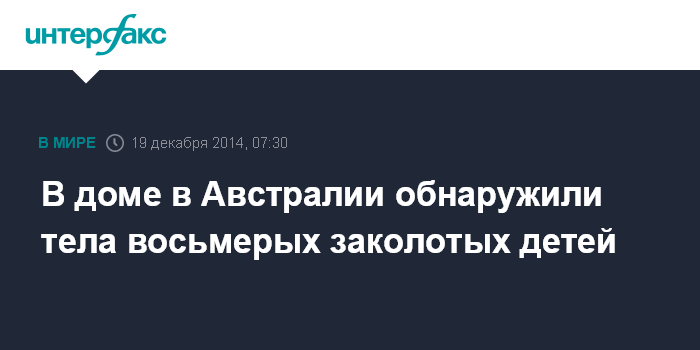 Москва. 19 декабря. INTERFAX.RU - Полиция австралийского штата Квинсленд в пятницу обнаружила в частном доме в пригороде города Кэрнс тела восьмерых детей в возрасте от 18 месяцев до 15 лет и пострадавшую женщину 34 лет с множественными ножевыми ранениями, сообщает утром в пятницу The New Zealand Herald.