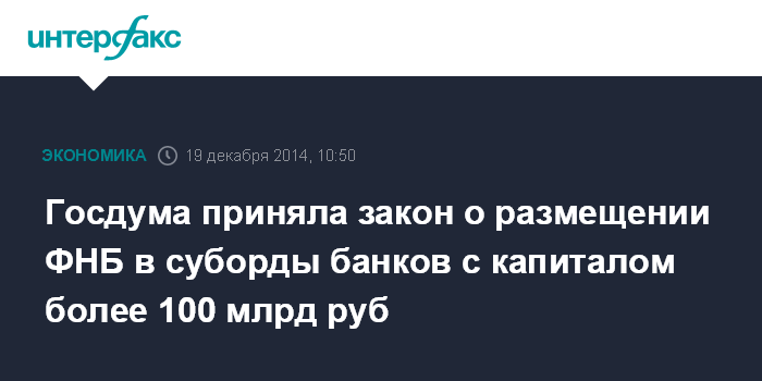 Москва. 19 декабря. INTERFAX.RU - Госдума заседании в пятницу приняла во втором и третьем чтении законопроект, позволяющий направлять до 10% средств Фонда национального благосостояния в субординированные депозиты или облигации банков с капиталом не менее 100 млрд рублей.