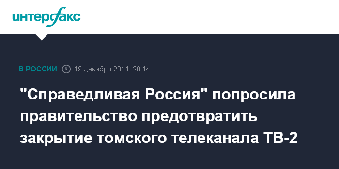 Москва. 19 декабря. INTERFAX.RU - Партия "Справедливая Россия" попросила руководство ФАС и Минкомсвязи предотвратить закрытие томского телеканала ТВ-2.