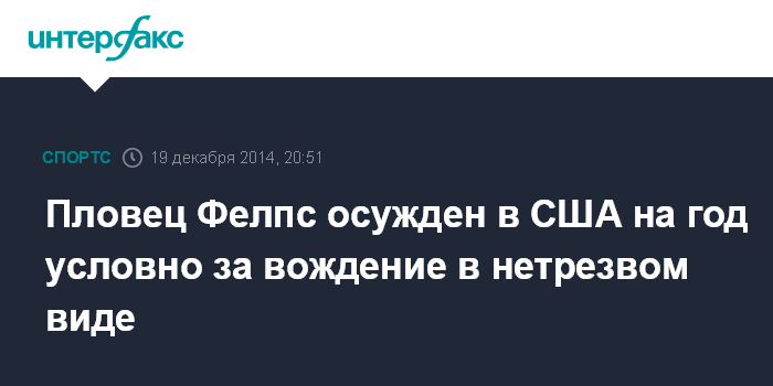 Москва. 19 декабря. INTERFAX.RU - Суд в США признал виновным знаменитого американского пловца Майкла Фелпса в вождении в нетрезвом виде и приговорил его к году тюремного заключения условно, сообщает CBS News.