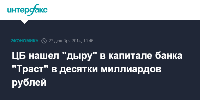 Москва. 22 декабря. INTERFAX.RU - "Дыра" в капитале банка "Траст" оценивается в десятки миллиардов рублей, сообщил заместитель председателя ЦБ РФ Михаил Сухов.
