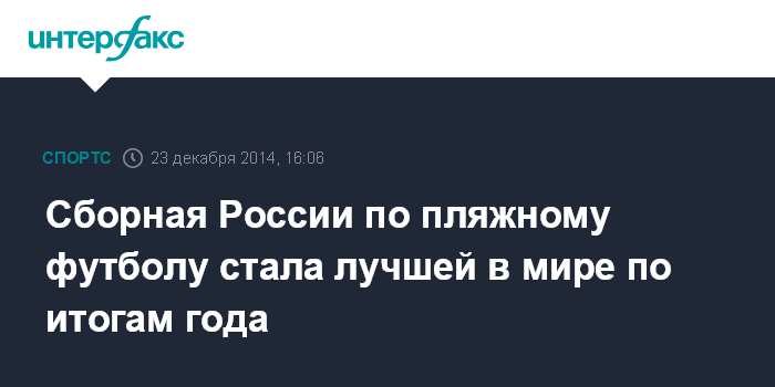 Москва. 23 декабря. INTERFAX.RU - Сборная России по пляжному футболу завершает 2014 год на первом месте в итоговом рейтинге Всемирной организации пляжного футбола.