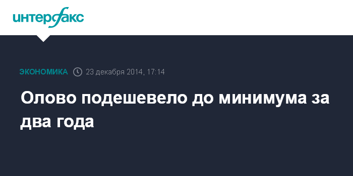Москва. 23 декабря. INTERFAX.RU - Стоимость олова упала в ходе торгов во вторник до минимума за два года, поскольку обнародованные накануне данные по рынку жилья США вызывают у инвесторов опасения сокращения спроса на этот металл, сообщает агентство Bloomberg.