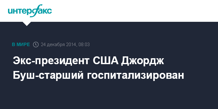 Москва. 24 декабря. INTERFAX.RU - Бывший президент США Джордж Буш-старший был госпитализирован в одну из больниц Хьюстона после того, как ощутил проблемы с дыханием, сообщают его представители, передает BBC News.