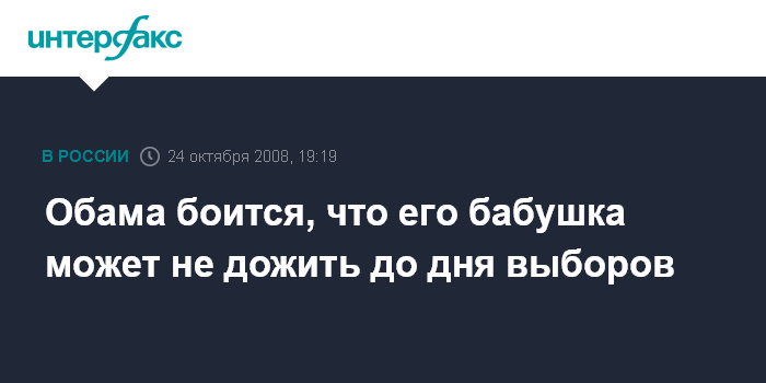 Москва. 24 октября. INTERFAX.RU - Кандидат в президенты США от демократов Барак Обама заявил, что его тяжело больная бабушка, возможно, не доживет до дня выборов, сообщает в пятницу американский телеканал ABС.