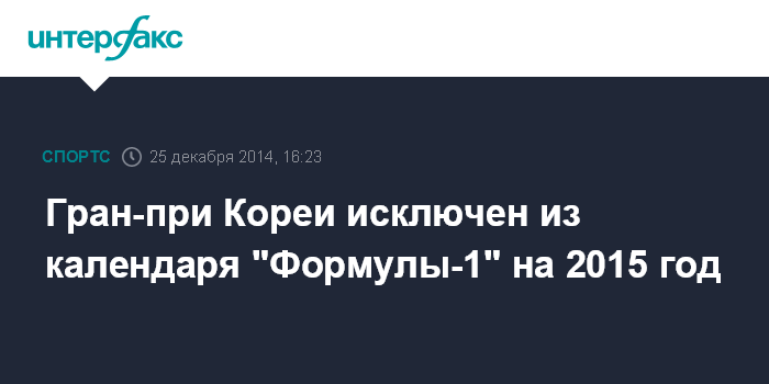 Москва. 25 декабря. INTERFAX.RU - В обновленной версии календаря "Формулы-1" на 2015 год, опубликованной Международной федерацией автоспорт (FIA), значатся только 20 гонок, Гран-при Кореи в нем отсутствует.