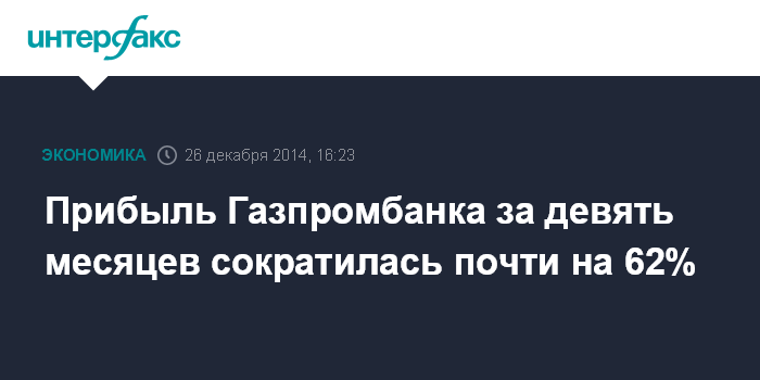 Москва. 26 декабря. INTERFAX.RU – Газпромбанк в январе-сентябре 2014 года сократил чистую прибыль по международным стандартам финансовой отчетности (МСФО) на 61,6% - до 9,2 млрд рублей, свидетельствует информация на сайте кредитной организации.
