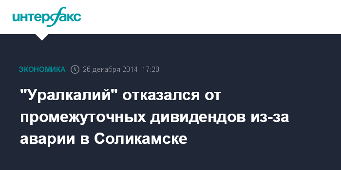 Москва. 26 декабря. INTERFAX.RU – Акционеры "Уралкалия" на внеочередном собрании 26 декабря приняли решение не выплачивать промежуточные дивиденды в размере 2,96 рубля на акцию из-за аварии в Пермском крае.