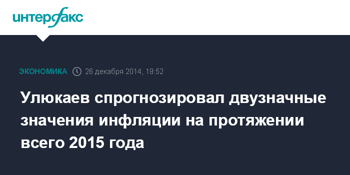 Москва. 26 декабря. INTERFAX.RU - Глава Минэкономразвития Алексей Улюкаев считает, что инфляция в годовом выражении останется на двузначном уровне в течение всего 2015 года и к концу следующего года может снизиться до 10%.