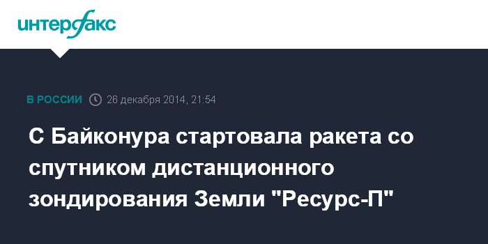 Москва. 26 декабря. INTERFAX.RU - Ракета-носитель "Союз-2.1б" с космическим аппаратом дистанционного зондирования Земли "Ресурс-П" №2 стартовала в пятницу с космодрома Байконур, сообщили "Интерфаксу" в Федеральном космическом агентстве (Роскосмос).