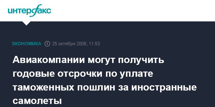 Москва. 25 октября. INTERFAX.RU - Российские авиакомпании могут получить отсрочки сроком на год по уплате таможенных пошлин и НДС на воздушные суда иностранного производства и комплектующие к ним, заявил вице-премьер РФ Сергей Иванов на совещании в субботу, посвященном ситуации в авиаотрасли.