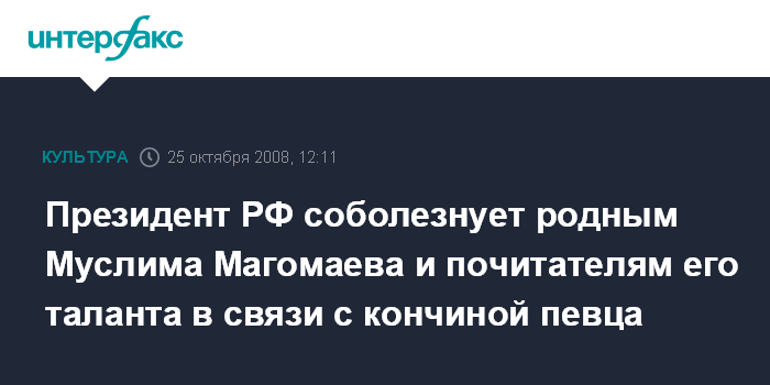 Москва. 25 октября. INTERFAX.RU - Президент России Дмитрий Медведев выразил глубокие и искренние соболезнования в связи с кончиной Муслима Магомаева его супруге, родным и близким, а также почитателям таланта артиста, сообщает пресс-служба Кремля.