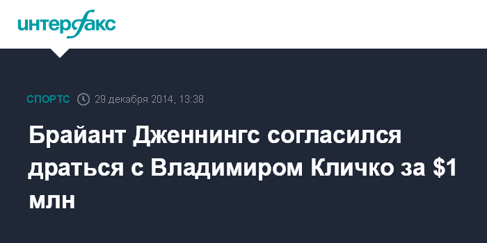 Москва. 29 декабря. INTERFAX.RU - Американский супертяжеловес Брайант Дженнингс согласился на гонорар в размере $1 млн за участие в поединке против чемпиона мира в супертяжелом весе по версиям IBF, WBA, WBО, IBO и журнала The Ring украинца Владимира Кличко, сообщает boxnews.com.ua.