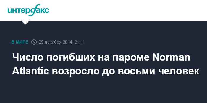 Москва. 29 декабря. INTERFAX.RU – Не менее восьми человек стали жертвами пожара на итальянском пароме Norman Atlantic, терпящем бедствие в Адриатическом море, сообщают в понедельник итальянские СМИ.