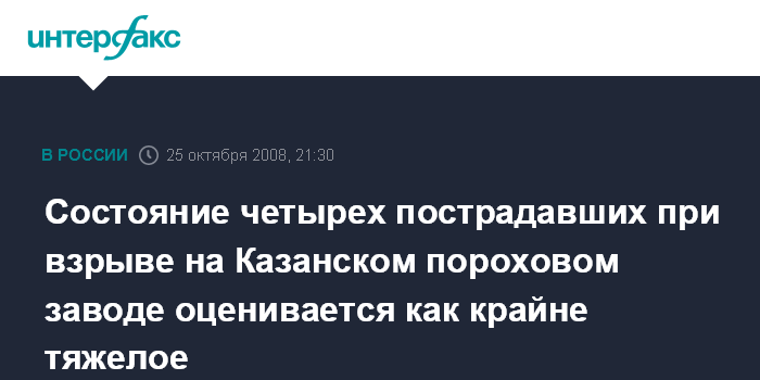 Казань. 25 октября. ИНТЕРФАКС-ПОВОЛЖЬЕ - Врачи Татарстанской республиканской клинической больницы в субботу борются за жизнь пятерых человек, пострадавших от взрыва на Казанском пороховом заводе.