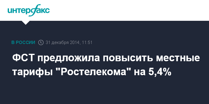 Москва. 31 декабря. INTERFAX.RU - Федеральная служба по тарифам (ФСТ) предлагает повысить предельные максимальные тарифы ОАО "Ростелеком" на местную связь на 5,4%. Соответствующий проект приказа ФСТ опубликован на портале для общественного обсуждения.