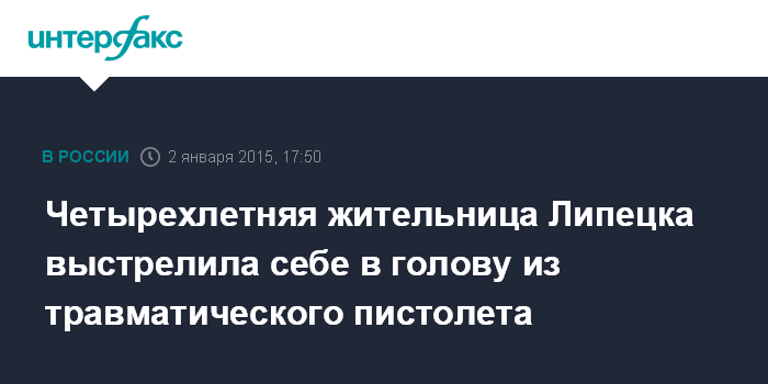Москва. 2 января. INTERFAX.RU - Четырехлетняя девочка госпитализирована в Липецке с ранением, которое она получила, выстрелив в себя из травматического пистолета, сообщили "Интерфаксу" в УМВД России по Липецкой области в пятницу.