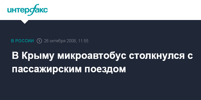 Киев. 26 октября. INTERFAX.RU - В Крыму в результате столкновения микроавтобуса "Опель" с пассажирским поездом "Симферополь - Одесса" на регулируемом железнодорожном переезде один человек погиб, два - травмированы, сообщает пресс-служба Министерства по вопросам чрезвычайных ситуаций в воскресенье.