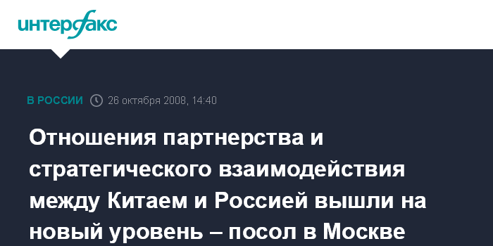 Москва. 26 октября. INTERFAX.RU - События 2008 года показали, что китайско-российские отношения партнерства и стратегического взаимодействия в самых разных областях вышли на новый высокий уровень, заявил в интервью агентству "Интерфакс-Китай" посол Китая в России Лю Гучан.
