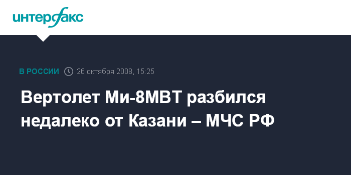 Москва. 26 октября. INTERFAX.RU - Вертолет Ми-8МВТ разбился недалеко от Казани, есть данные об одном погибшем, сообщил "Интерфаксу" в воскресенье оперативный дежурный МЧС РФ.