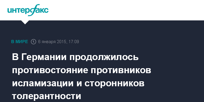 Москва. 6 января. INTERFAX.RU - Ряд известных политических и общественных деятелей Германии подписали декларацию против организации "Пегида", которая в знак протеста против исламизации Германии вывела тысячи своих сторонников на улицы германских городов.