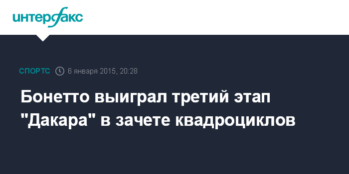 Москва. 6 января. INTERFAX.RU - Аргентинец Лукас Бонетто стал победителем третьего этапа "Дакара"-2015 в зачете квадроциклов.