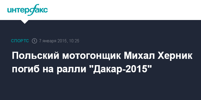 Москва. 7 января. INTERFAX.RU - Польский мотогонщик Михал Херник погиб во время гонки на "Дакаре"-2015, сообщает L'Euqipe.