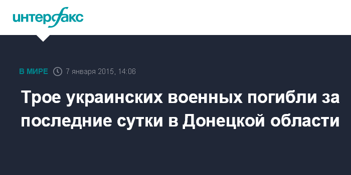 Москва. 7 января. INTERFAX.RU - Трое украинских военнослужащих погибли, один получил ранения в Донецкой области за минувшие сутки, сообщил Андрей Лысенко - представитель пресс-центра спецоперации, проводимой на востоке Украины.