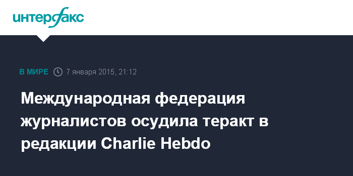 Москва. 7 января. INTERFAX.RU - Международная федерация журналистов, штаб-квартира которой находится в Брюсселе, осуждает террористический акт против Charlie Hebdo в Париже, говорится в коммюнике организации, поступившем в "Интерфакс".