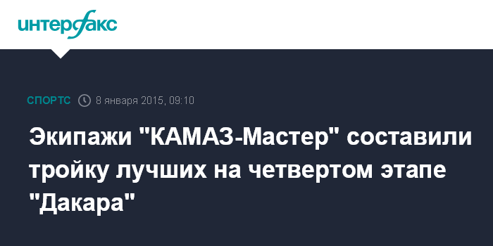 Москва. 8 января. INTERFAX.RU - Три экипажа российской команды "КАМАЗ-Мастер" вошли в тройку сильнейших по итогам четвертого этапа ралли-рейда "Дакар"-2015 в зачете грузовиков.