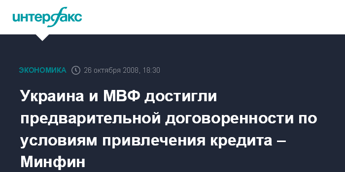 Киев. 26 октября. INTERFAX.RU - Украина и МВФ договоренности об условиях привлечения кредита для поддержания кономической стабильности страны в условиях мирового финансового кризиса.