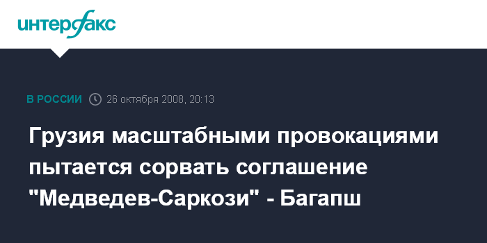 Сухуми. 26 октября. ИНТЕРФАКС - Президент Абхазии Сергей Багапш обвинил Грузию в масштабных вооруженных провокациях, целью которых является срыв соглашения "Медведев-Саркози".