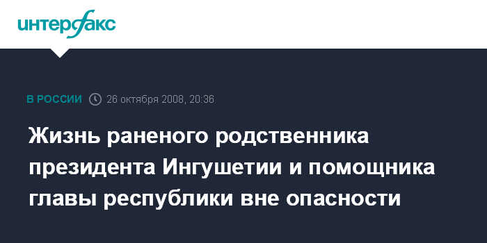Москва. 26 октября. ИНТЕРФАКС - Родственнику президента Ингушетии, заместителю министра экономики республики Арсамаку Зязикову и помощнику главы Ингушетии Саиду Котиеву, пострадавшим в результате подрыва автомобиля, оказана медицинская помощь, их жизни вне опасности.