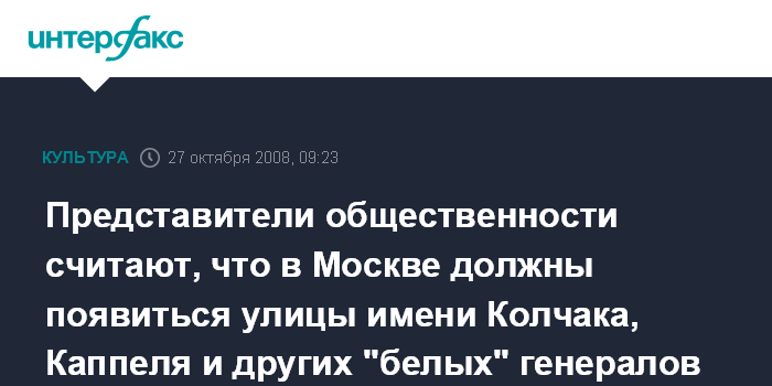 "К сожалению, трудно представить себе, чтобы при нынешних властях в Москве появился Колчаковский проспект или Каппелевская улица. Чем они были бы хуже существующих Марксистской улицы или улицы Фридриха Энгельса?" - заявил порталу "Интерфакс-Религия" (www.interfax-religion.ru) координатор проекта Юрий Бондаренко.