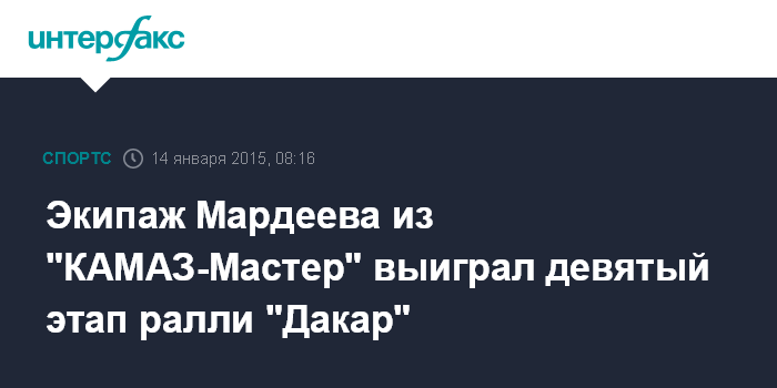 Москва. 14 января. INTERFAX.RU - Экипаж Айрата Мардеева из российской команды "КАМАЗ-Мастер" стал победителем девятого этапа ралли "Дакар"-2015 в зачете грузовиков.