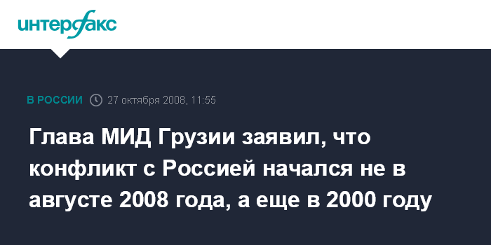 Москва. 27 октября. INTERFAX.RU – Глава МИД Грузии Екатерина Ткешелашвили заявляет, что конфликт с Россией берет свое начало еще в 2000 году.