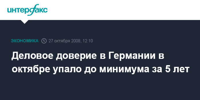 Москва. 27 октября. INTERFAX.RU – Индекс доверия германских предпринимателей к экономике страны в октябре упал до 90,2 пункта, что является минимальной отметкой за более чем пять лет, по сравнению с 92,9 пункта месяцем ранее, сообщило агентство Bloomberg со ссылкой на данные исследовательского института Ifo. Аналитики ожидали снижения индекса до 91 пункта.