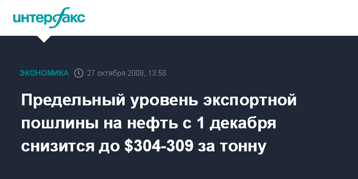 Москва. 27 октября. INTERFAX.RU - Предельный уровень экспортной пошлины на нефть, которая будет установлена с 1 декабря, составит $304-309 за тонну, сообщил агентству "Интерфакс-АФИ" заместитель начальника отдела таможенных платежей Минфина РФ Александр Сакович.