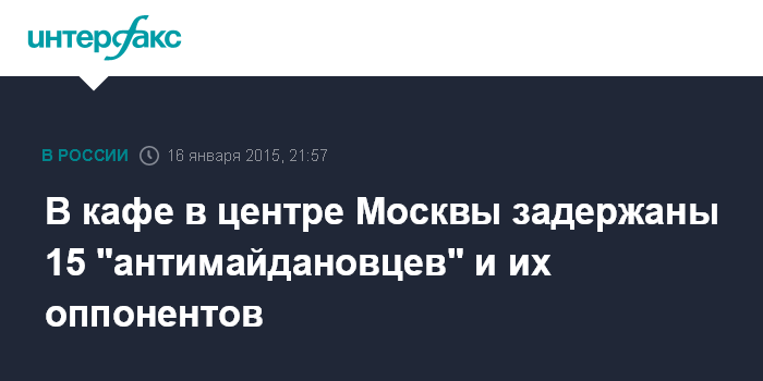 Москва. 16 января. INTERFAX.RU - Около 15 человек задержано в результате конфликта между сторонниками движения "Антимайдан" и их оппонентами в кафе в центре Москвы, сообщили "Интерфаксу" в пятницу в пресс-службе столичной полиции.