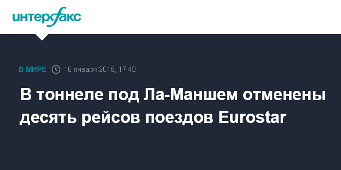 Москва. 18 января. INTERFAX.RU - Руководство компании Eurostar решило отменить в воскресенье во второй половине дня 10 рейсов через тоннель под проливом Ла-Манш в связи с техническими неполадками, сообщают парижские СМИ. В компании пояснили, что это связано с проблемами с подачей электроэнергии в тоннеле.