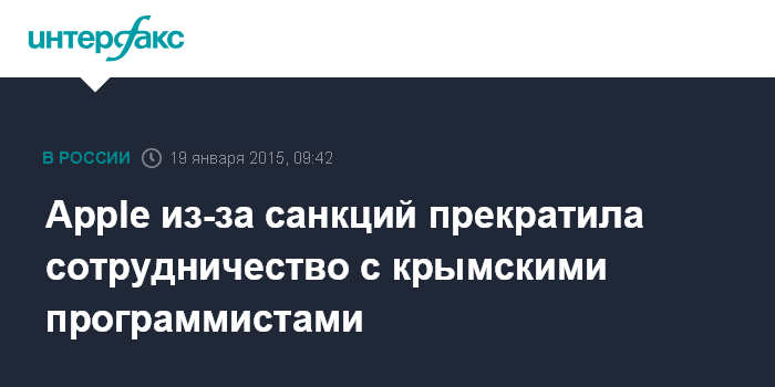 Он предоставил "Интерфаксу" текст полученного от Apple извещения о прекращении сотрудничества, в котором компания объясняет свое решение вступлением в силу санкций против Крыма.