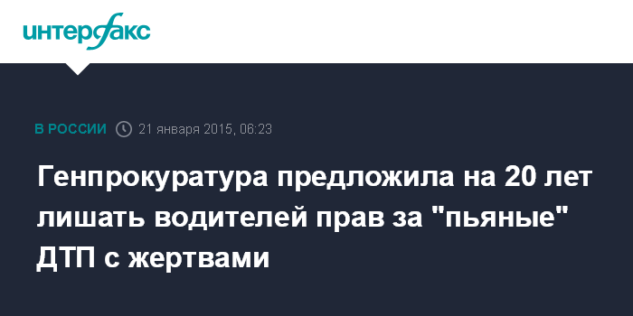 Москва. 21 января. INTERFAX.RU - Генпрокуратура считает, что водителей, совершивших в пьяном виде ДТП со смертельным исходом, следует лишать водительских прав на срок до 20 лет, сообщает в среду газета "Известия".